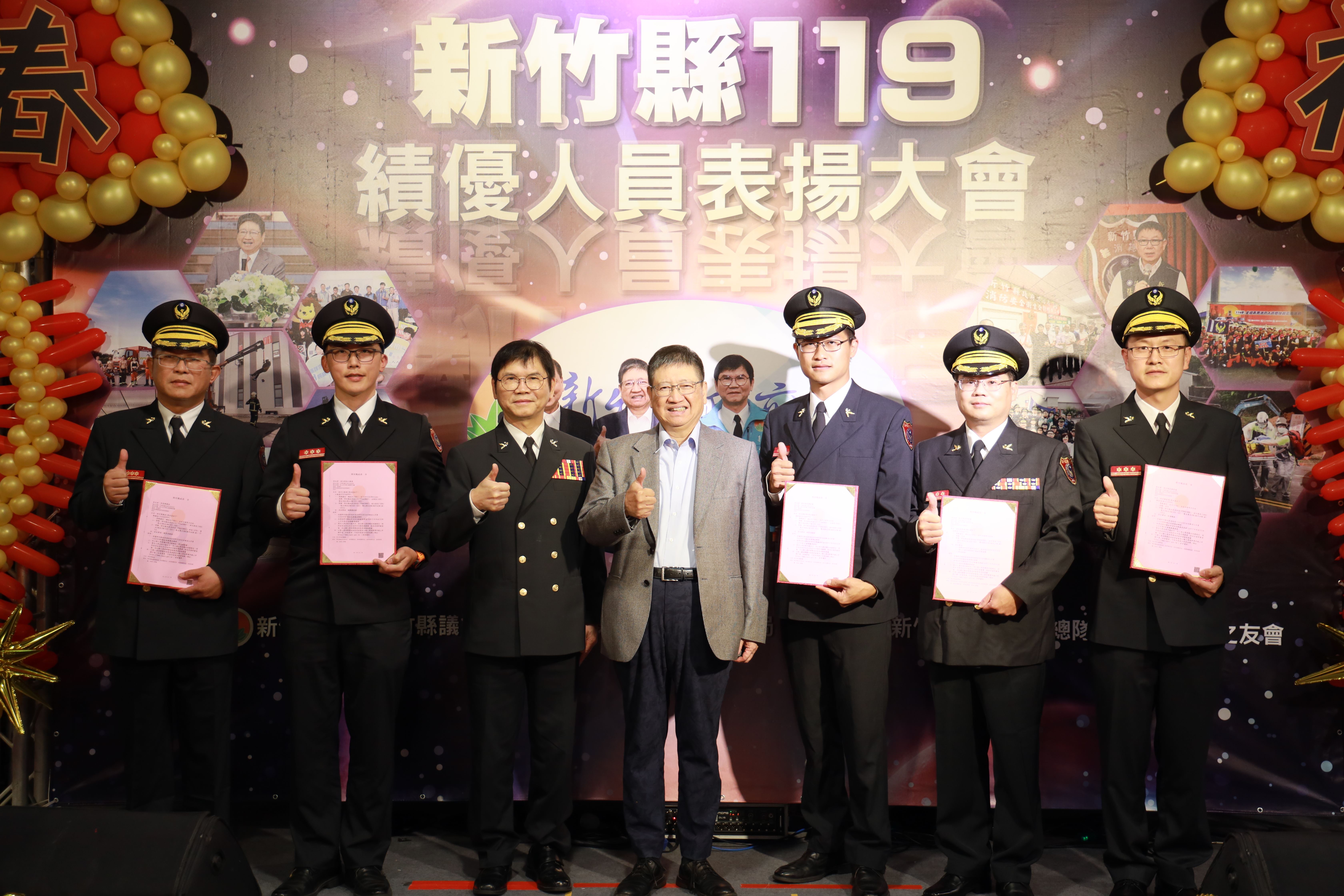 迎接119消防節,新竹縣長楊文科17日親自表揚年度績優消防及義消人員,肯定他們無私奉獻的精神。楊文科承諾將持續支持消防工作,並與打火英雄們共同守護縣民安全。