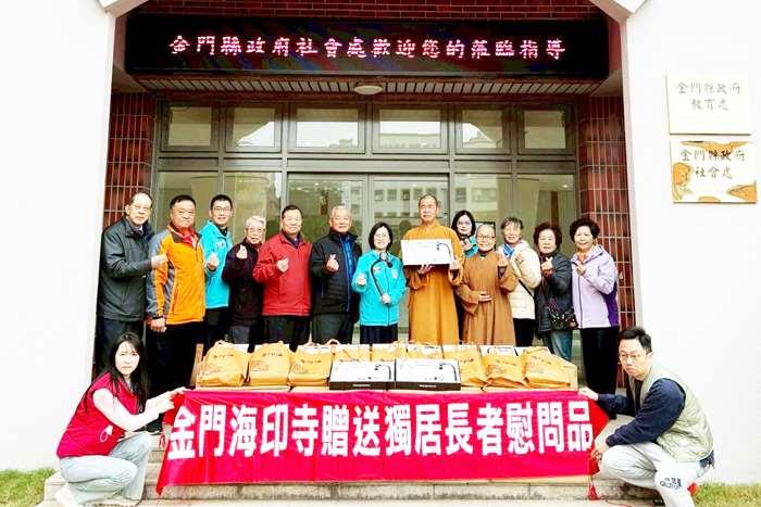 農曆春節腳步將近,金門地區近日氣溫驟降,為了讓獨居長者能溫暖過冬,金門知名古剎太武山海印寺再度發揮慈悲精神,於昨(20)日舉辦寒冬送暖活動,捐贈215份春節慰問禮盒給全縣的獨居長輩。金門縣政府社會處處長王茲繐代表縣長陳福海接受捐贈,並感謝海印寺長年來的善舉,為社會注入一股暖流。