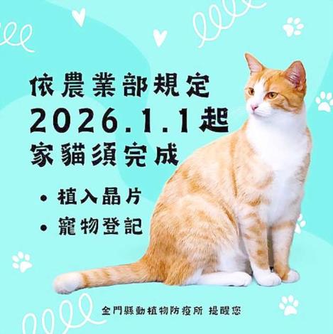 金門貓奴當心荷包!2026年起,家貓若未植入晶片及完成寵物登記,飼主將面臨最高1萬5千元的罰鍰。金門縣動植物防疫所呼籲民眾儘速辦理,保障毛孩也避免受罰。
