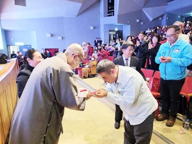 除了回顧全球足跡,活動也聚焦金門在地的服務成果。慈濟金門共修處特別以行動劇呈現「輔具服務」的推動歷程。志工洪松柏分享,輔具團隊成立僅三年半,服務個案已超過一千人次,為有需要的鄉親提供了最即時的幫助。活動尾聲,證嚴上人透過影片開示,期許人人行善造福,並由德法與德澧兩位師父代表,將充滿祝福的福慧紅包送到每位參與者手中,祈願新的一年平安、祥和。