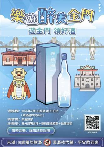 為振興淡季觀光,金門縣政府宣布將於2026年2月1日起至3月31日,推出「2026樂遊醉美金門-遊金門領好酒」活動。此次特別與金門酒廠合作,準備了一萬瓶專為活動設計的限量「霧橋海」300ml特製高粱酒,要免費送給來金門旅遊的遊客,希望能藉此吸引人潮,為在地觀光產業注入活水。