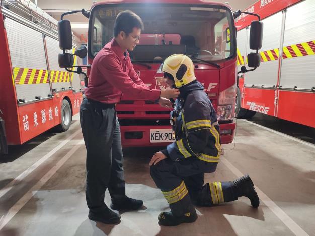 儀式的核心環節,是由隊上優秀的資深學長親手為新進同仁戴上消防帽。這個簡單而隆重的動作,不僅代表著專業技能的傳承,更寓意著「責任上肩、使命接棒」的神聖精神。從這一刻起,這批消防新血將正式肩負起守護民眾生命財產安全的重責大任,而身旁的師傅將是他們最堅實的後盾。