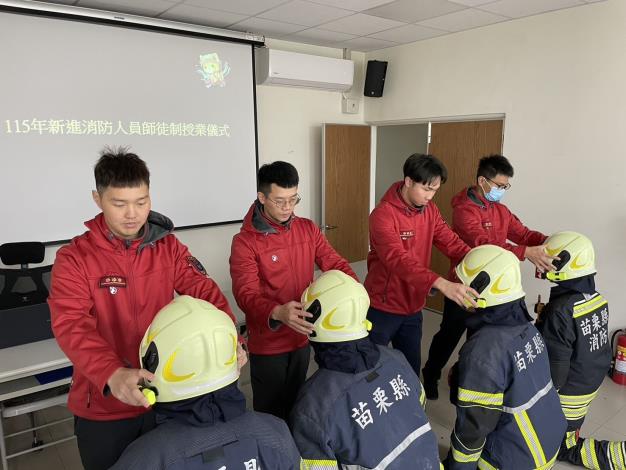 苗栗縣消防局第二大隊竹南分隊於今(22)日為4名新進同仁舉行了一場別具意義的「師徒制授業儀式」。儀式中,由經驗豐富的消防前輩擔任導師,親手為新進人員戴上消防帽,象徵著救災使命的薪火相傳,也代表著他們消防生涯的正式啟程。