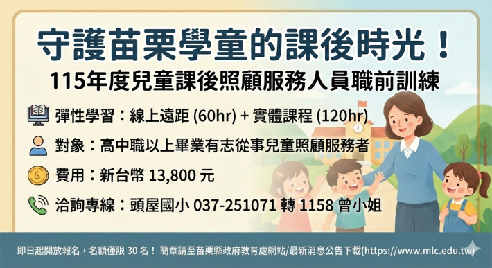 此次「兒童課後照顧服務人員職前訓練」由苗栗縣政府委託頭屋國小辦理,誠摯邀請有志於兒童教育服務的民眾踴躍參與。報名期限自即日起至2026年3月13日止。詳細資訊及簡章可至苗栗縣政府教育處網站的最新消息公告區下載,或於上班時間電洽037-251071轉1158,由曾小姐為您說明。