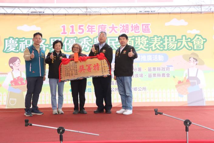 活動現場除了緊張的草莓評鑑外,也同步舉行了優秀農民表揚大會。縣府秘書長陳斌山、立委邱鎮軍、縣議員楊恭林、劉美蘭及大湖鄉長黃惠琴等多位貴賓皆到場,向深耕在地的農業英雄們致敬。表揚對象涵蓋優秀農友、產銷班、家政班班長、田媽媽及傑出青年農民等,展現了農業技術的青銀傳承與堅實力量。此外,現場的家政班與四健會成果展,也秀出了農村婦女和青年的創意與活力。